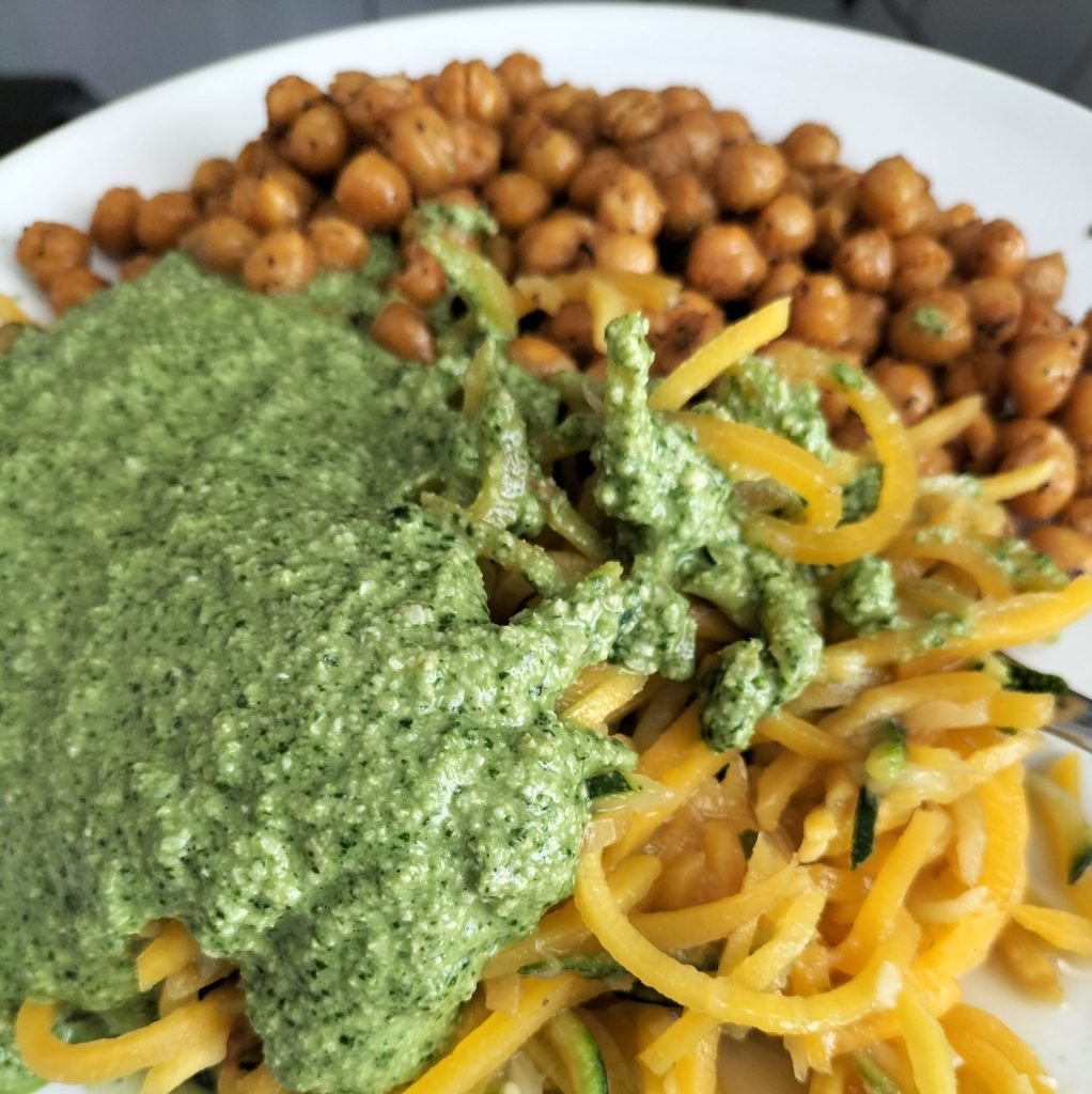 Groentenspaghetti met geroosterde kikkererwten en pestosaus